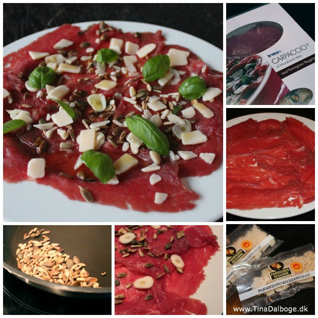 Læg de tynde skiver fint ud på en tallerken. Pift det op med fx. ristede solsikke- og græskarkerner som her. Det er også godt med ristede pinjekerner. Tynde skiver hvidløg som kan spises, eller som bare ligger for at give smag. Parmasanen som følger med i pakken og gerne mere hvis du har. Friske basilikumblade er altid godt. Jeg kan også godt lide kapers eller tynde skiver af oliven. Så vælg det du bedst kan lide eller det du har ved hånden. Dråber af god olivenolie og friskkværnet peber giver lige det sidste. Og godt med dejligt brød til – og måske et glas rødvin hvis man er heldig.