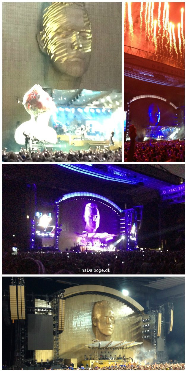 I går sluttede vi vores “Kør ud i det blå”- ferie rundt i det dejlige Danmark, med at høre Robbie Williams i Parken. Noget af et show og noget af en entertainer. Robbies ansigt var lavet i 3D i kæmpe store størrelser. Som du kan se, så hang han i guld over scenen. Senere på aftenen kørte der en film hen over så ansigtet blev levende, – både som ham selv, som en abe og med en masse flot grafisk der væltede ud af hovedet på ham. Der var også flere store hoveder der kørte rundt på scenen… Det var selvsagt noget “Hokus Pokus – mig i fokus”, – men da han samtidig havde så fed en selvironi, så blev det slet ikke for meget. Og helt ærligt… Når man kan sælge knap en million billetter på en turné, så skal man vel også have lov til at være i fokus. 🙂